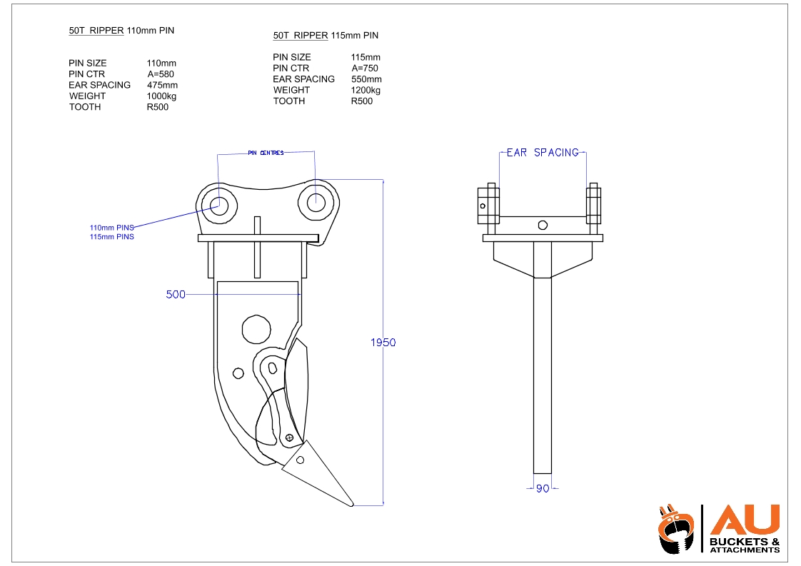 AU 1330mm long ripper with tooth and shroud, 115mm Pin, 580mm (CP to CP), 475mm (IBE)
